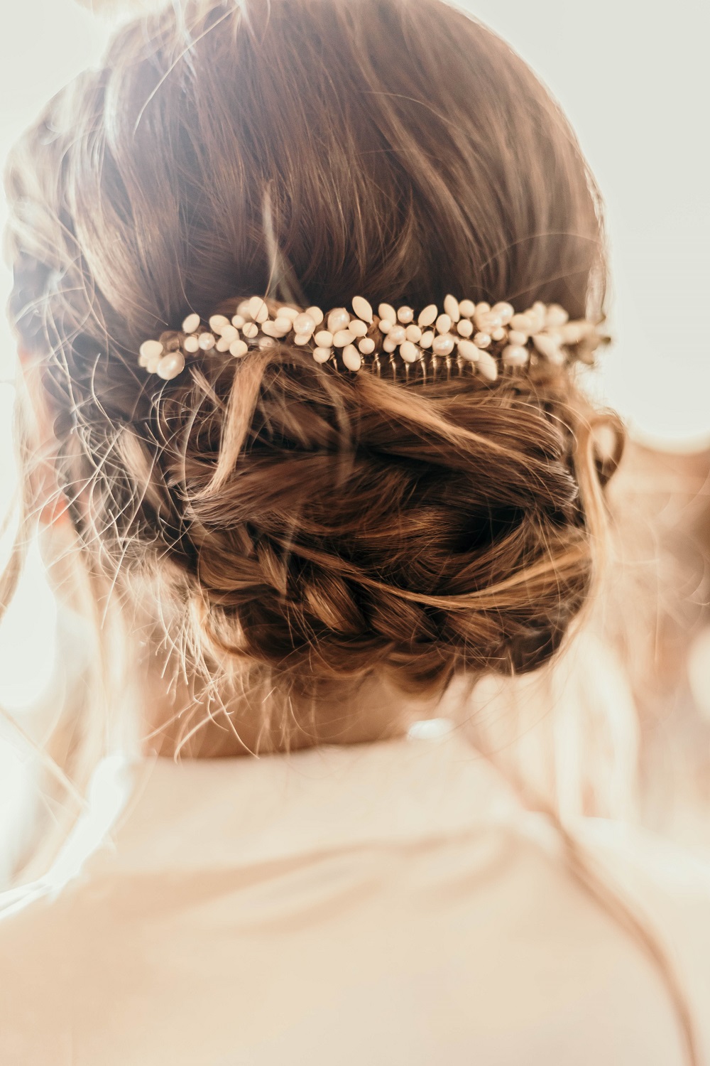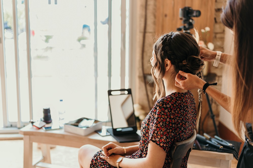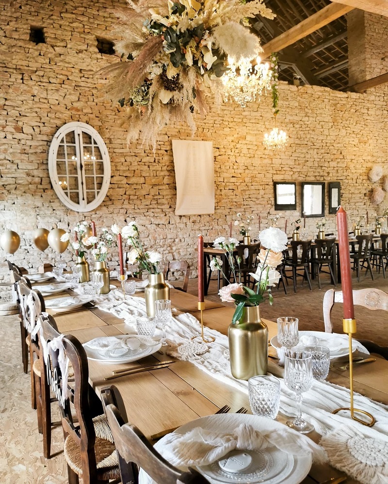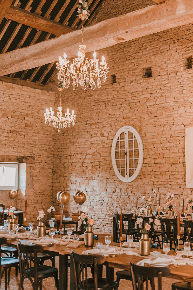 Samedi, le jour J. La cérémonie avait lieu à 16h. Tout se passait sur le domaine, donc dès le matin nous sommes allés sur place. Nous installions la décoration depuis le mardi, mais il restait des choses de dernières minutes à mettre en place : les fleurs fraiches à la cérémonie, sur les tables, en bas du gâteau, les sacs de bienvenue sur les bancs, les pétales à lancer dans les coupelles dorées... Et surtout la décoration extérieure ! Mais pas de chance, il a plu ce matin là jusqu'aux environs de 11h, donc impossible d'installer quoique ce soit dehors avant cette heure là. J'en ai profité pour me faire coiffer assez tôt le matin. On voulait éviter de se croiser avec M. Dress mais c'était un peu compliqué en restant tous sur le domaine, il m'a donc vu coiffée avant l'heure. Mais il n'a vu ni le maquillage, ni la robe avant, on tenait vraiment à se découvrir au moment de la cérémonie. Niveau coiffure, comme j'avais des boucles et une couronne de fleurs le vendredi, je voulais vraiment une coiffure beaucoup plus étudiée pour le samedi. J'avais craqué sur des coiffures avec un chignon bas et de grosses tresses sur le côté, je suis donc partie sur cette idée là. Si c'était à refaire, je demanderais beaucoup moins de mèches sur les côtés, mais j'étais très contente de ce joli chignon réalisé par Reborn Hair Coiffure.